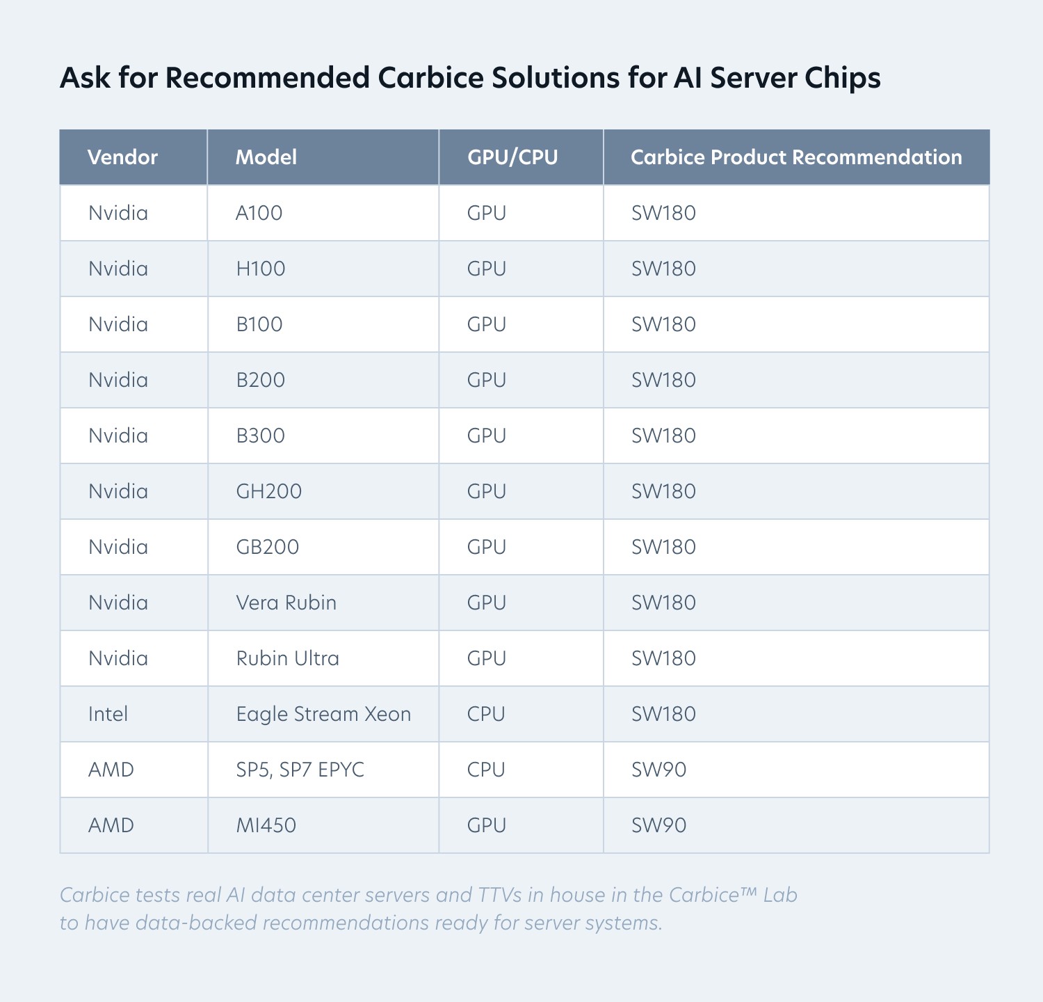 For organizations designing, operating, or capitalizing AI data center infrastructure, thermal interfaces should be treated as an economic variable—not a commodity. Carbice has validated thermal performance across leading AI CPU and GPU platforms using real application testing, enabling clear, data-driven material selection. The recommendations below map Carbice solutions to common AI server chips: