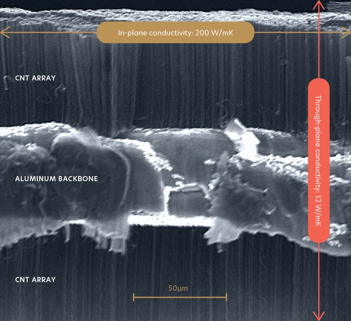 Carbice Pads overcome the need for this tradeoff in through-plane and in-plane thermal conductivity with its unique architecture. By growing vertically aligned carbon nanotubes directly on a metal foil core, Carbice Pad exhibits high thermal conductivity through-plane through the carbon nanotubes, 12 W/mK, and very high thermal conductivity in-plane within the metal core, 200 W/mK.