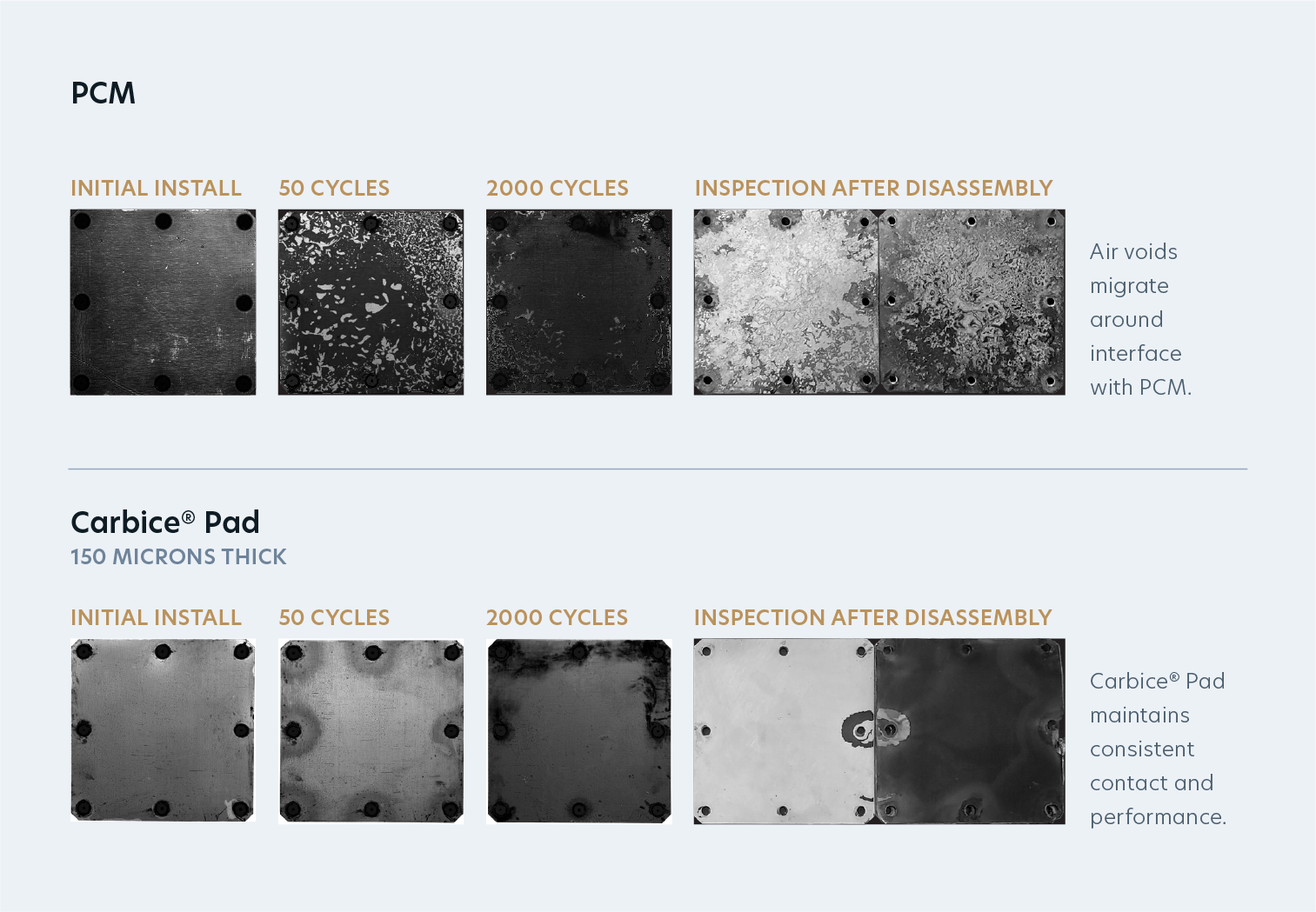 Third party test by NREL demonstrates Carbice’s ability to withstand shear delamination during long-term cycling compared to phase-change material (PCM).