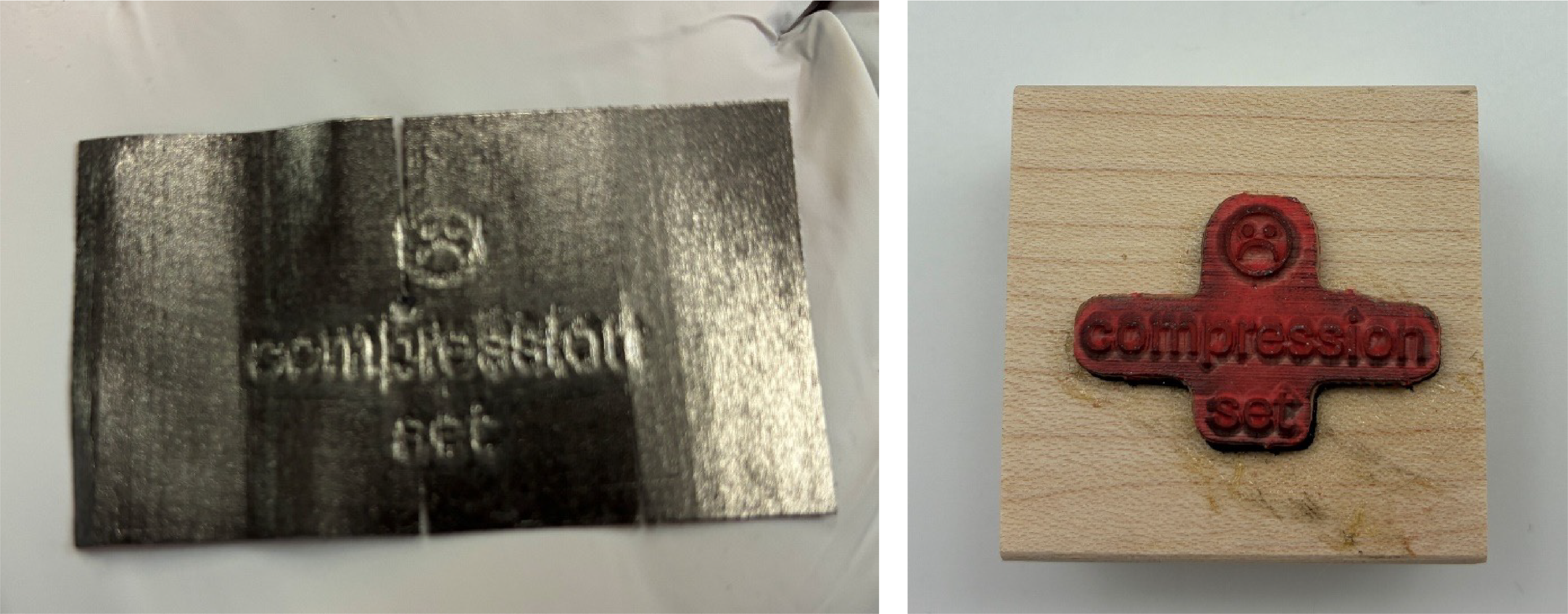 Aligned graphite TIM embossed with stamp (shown on the right) demonstrating lack of elasticity, leading to compression set.